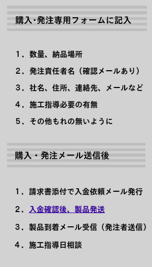 左の手順は、発注専用メールでお受けします。電話やFAXではお受けできません。 (工事業界もWEB活用で時代の流れに乗りましょう.) ご入金確認後に製品発送を行いますので、納期の少ない発注はご注意願います。納品希望日は余裕を持ち、工程に先行して早めに発注願います。 また、施工指導も急な依頼には対応できませんので、前もって10日以上前に依頼願います。 納品時には数量の確認を実施願います。製品到着後、時間経過しての数量不足などはお受けできませんので、納品時の数量確認は確実に実施願います。.