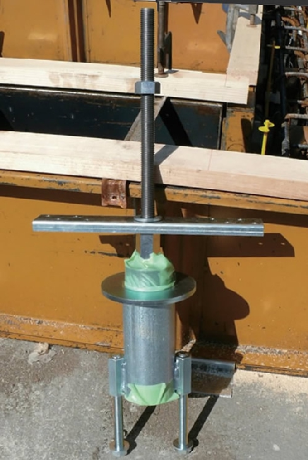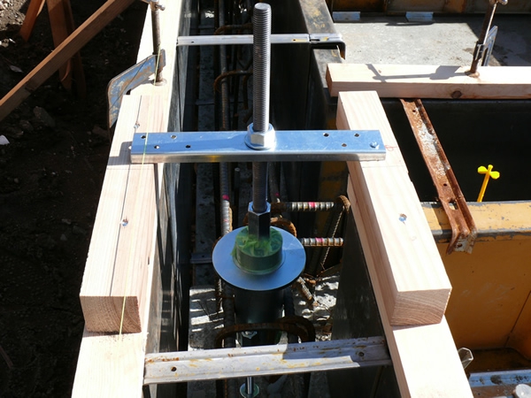 写真のように組み上げ本体上部吸震ゴムパッキンと、本体下部開口部をシールします。コンクリートの付着や異物の侵入を防ぎます。この一手間で、吸震性能は安定して得ることが出来ます。また、絶対に上部吸震ゴムパッキン下端以上に天端が上にならぬように管理願います。