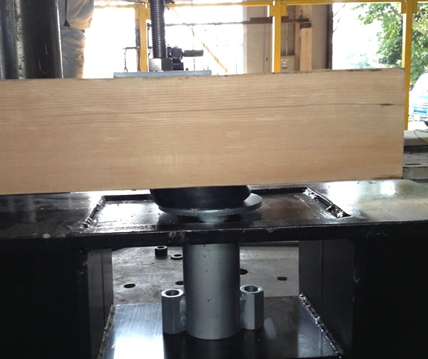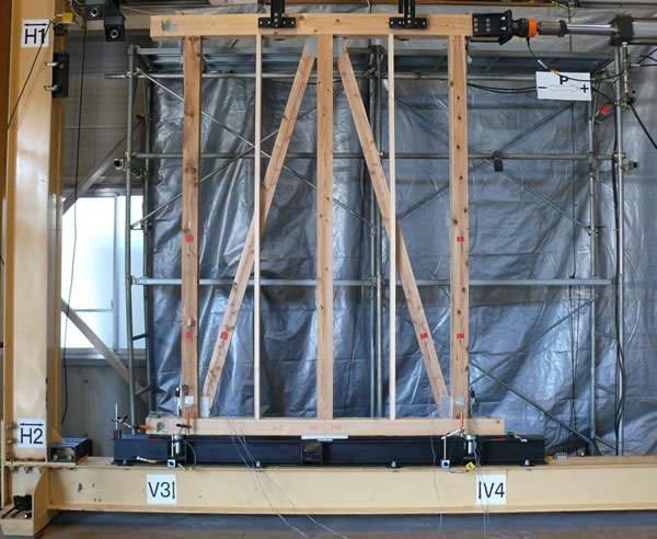耐力壁と土台下に吸震式アンカーボルトを設置しての変性応力試験を実施。福島県森林研究所にて実施。